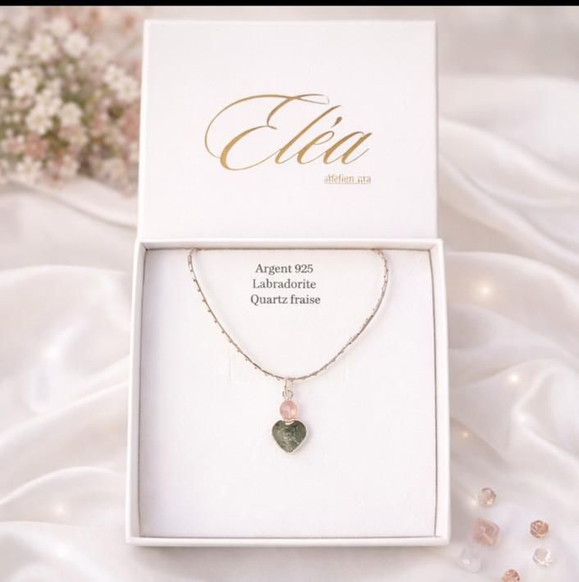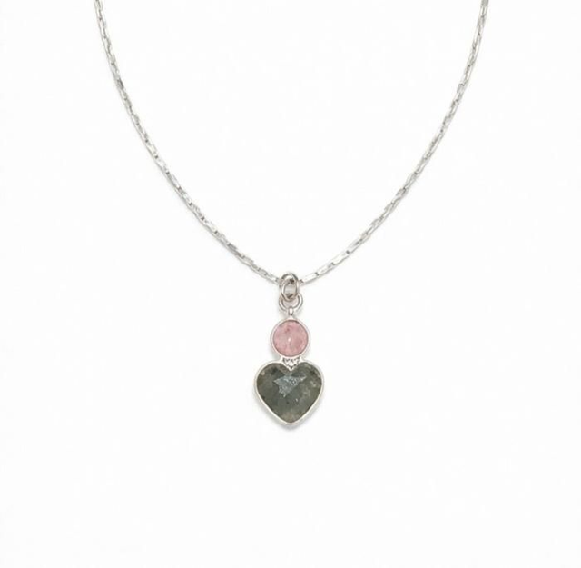 Collier en argent 925 avec labradorite en cœur et quartz fraise. Bijou bohème chic, délicat et lumineux, création artisanale française.
